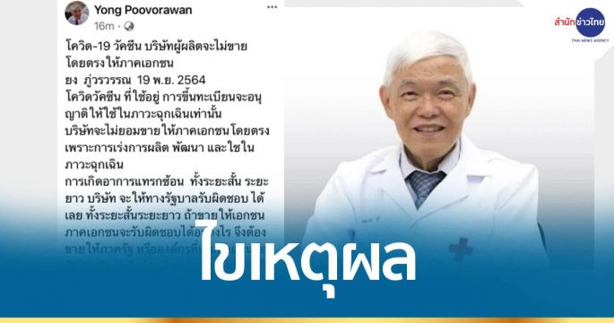 “หมอยง ”ไขเหตุผลที่บริษัทผู้ผลิตวัคซีนโควิด-19 ไม่ขายตรงให้กับภาคเอกชน ต้องผ่านภาครัฐ เพราะการขึ้นทะเบียนอนุญาตให้ใช้ในภาวะฉุกเฉินเท่านั้น