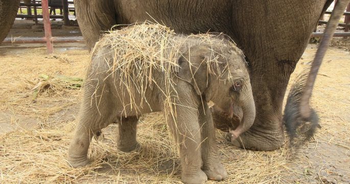 พังการะเกด อายุ 28 ปี ช้างของวังช้างอยุธยาแลเพนียด ตกลูกช้างเพศผู้ น้ำหนักประมาณ 80 กิโลกรัม กลางเพนียดหลวง