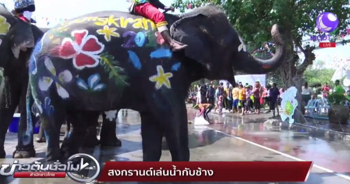 วังช้างอยุธยาแลเพนียด จ.พระนครศรีอยุธยา นำช้าง 8 เชือกมาทาสีเพื่อสร้างสีสัน ก่อนจัดขบวนแห่ไปร่วมงานสรงน้ำพระพุทธรูป เพื่อสร้างความเป็นสิริมงคล