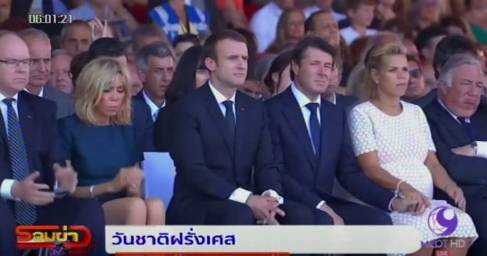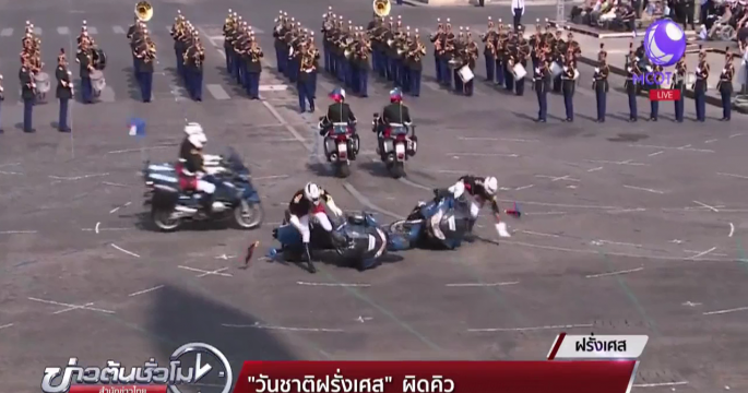 ฝรั่งเศส 14 ก.ค.-ฝรั่งเศสจัดฉลองวันชาติอย่างยิ่งใหญ่ในปีนี้ มีทหารหลายพันนายเข้าร่วมพาเหรดที่ฌ็องอะลิเซ่ ในกรุงปารีส โดยนายเอ็มมานูเอล มาคร็อง ประธานาธิบดีฝรั่งเศสเป็นประธาน มี นายลี เซียนลุง นายกรัฐมนตรีสิงคโปร์เข้าร่วมพิธีด้วย ในช่วงสำคัญของพิธีนั้น เครื่องบินรบอัลฟ่าเจ็ทกองทัพฝรั่งเศส ขึ้นบินเหนือบริเวณพิธีและปล่อยควันสีออกมา เพื่อแสดงแถบสีธงชาติของฝรั่งเศส แต่เครื่องบินลำหนึ่งปล่อยสีผิดพลาด จากสีน้ำเงินเป็นสีแดง อีกทั้งในช่วงเดินสวนสนามของตำรวจด้วยจักรยานยนต์ ก็เกิดความผิดพลาดอีก เมื่อจักรยานยนต์สองคันเฉี่ยวชนกันจนล้ม แต่ตำรวจทั้งสองนายได้รับกำลังใจจากเสียงปรบมือจากผู้นำและผู้เข้าร่วมพิธี.-สำนักข่าวไทย