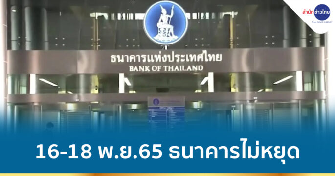 ธปท. กำหนดให้วันที่ 16-18 พ.ย. 2565 เป็นวันทำการตามปกติของสถาบันการเงินและสถาบันการเงินเฉพาะกิจ เพื่อไม่ให้ส่งผลกระทบต่อกิจกรรมทางเศรษฐกิจ