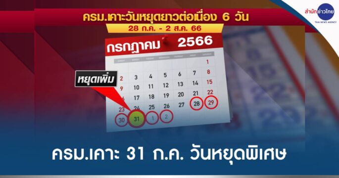 รองโฆษกรัฐบาล เผย ที่ประชุมครม.เคาะ 31 ก.ค.นี้เป็นวันหยุดราชการเพิ่มกรณีพิเศษอีก 1 วัน รวมปลายสัปดาห์นี้หยุดยาว 6 วัน จาก 28 ก.ค.ถึง 2 ส.ค.