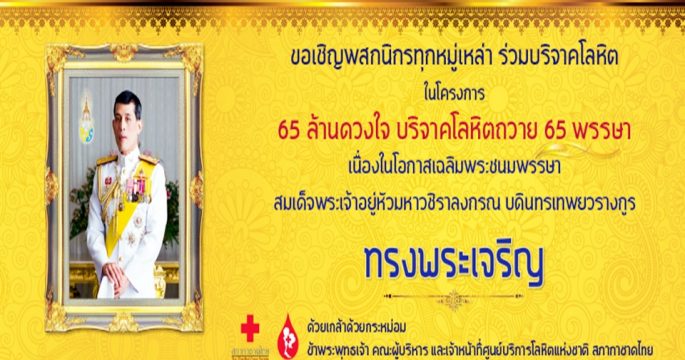 ศูนย์บริการโลหิตแห่งชาติ จัดโครงการ 65 ล้านดวงใจ บริจาคโลหิตถวาย 65 พรรษาเนื่องในโอกาสวันเฉลิมพระชนมพรรษา สมเด็จพระเจ้าอยู่หัวมหาวชิราลงกรณ บดินทรเทพยวรางกูร