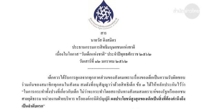 สารจากประธาน กสม.หวังเด็กเป็นกำลังสำคัญในการสร้างคุณค่าต่อสังคม ปลื้มรัฐบาลให้ความสำคัญต่อเด็ก