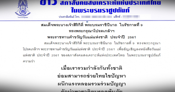 สมเด็จพระนางเจ้าสิริกิติ์ พระบรมราชินีนาถ ในรัชกาลที่ 9 พระราชทานคำขวัญวันแม่แห่งชาติ ประจำปี 2561