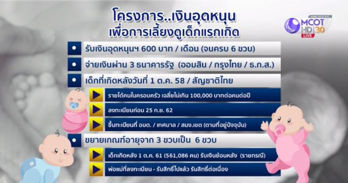 วันนี้เป็นวันแรกที่กระทรวงการพัฒนาสังคมและความมั่นคงของมนุษย์ เริ่มจ่ายเงินอุดหนุนเพื่อการเลี้ยงดูเด็กแรกเกิด ให้ผู้มีสิทธิที่มีข้อมูลครบถ้วนถูกต้องตามหลักเกณฑ์ที่ได้ยื่นลงทะเบียนไว้ โดยจ่ายเข้าบัญชีธนาคารเดือนละ 600 บาท