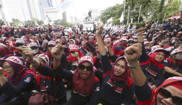 แรงงานค่าแรงต่ำหลายพันคนเดินขบวนตามท้องถนนในวันแรงงานที่กรุงจาการ์ตาของอินโดนีเซีย เพื่อขอขึ้นค่าแรง เพิ่มสวัสดิการ และปรับปรุงสภาพการทำงาน