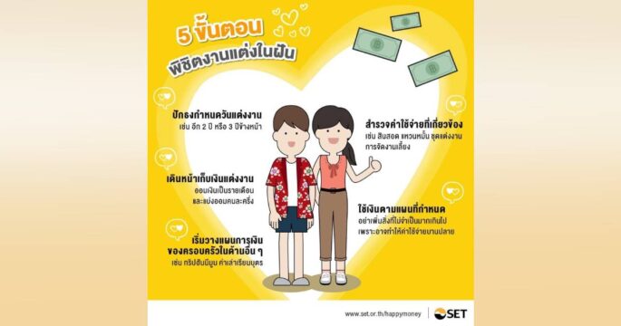 15 ก.พ. – เทศกาลวันแห่งความรัก เพิ่งผ่านไป หลายคู่มีโมเมนต์สวมแหวนคุกเข่าขอแต่งงาน การเตรียมตัวเพื่อจะแต่งงานนั้นมีหลายสิ่งหลายอย่างที่ต้องวางแผน เพื่อให้งานมีความสุขสมบูรณ์แบบและเก็บไว้เป็นความทรงจำดี ๆ มาเริ่มต้นวางแผนกันตั้งแต่วันนี้ กับ “5 ขั้นตอน พิชิตงานแต่งงานในฝัน” อ่านเนื้อหา “5 ขั้นตอน พิชิตงานแต่งในฝัน” เพิ่มเติมได้ที่ >>คลิก https://www.set.or.th/th/education-research/education/happymoney/wedding ที่มา: ตลาดหลักทรัพย์แห่งประเทศไทย