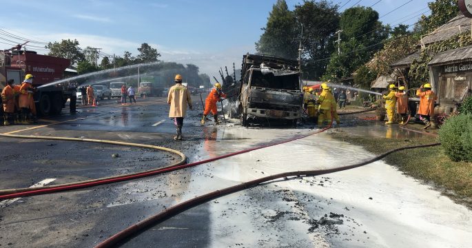 รถสิบล้อบรรทุกสินค้าเต็มคันจาก กทม. มุ่งหน้าอุบลฯ เกิดไฟลุกไหม้ไม่ทราบสาเหตุระหว่างทางบนถนนวารินชำราบ วอดทั้งคัน