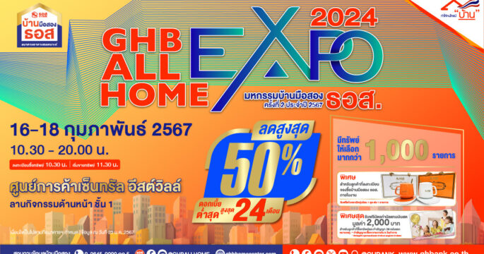 กรุงเทพฯ 14 ก.พ.-ธอส. ต้อนรับวาเลนไทน์!! จัดงาน GHB ALL HOME EXPO 2024 @เซ็นทรัล อีสต์วิลล์ รามอินทรานำทรัพย์เด่น ทำเลดีกว่า 1,000 รายการ ลดสูงสุดถึง 50%
