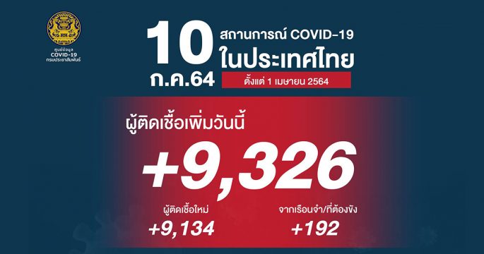 กรุงเทพฯ 10 ก.ค.-โควิดวันนี้ วิกฤติ เสียชีวิตพุ่ง 91 ราย ยอดติดเชื้อรวม 9,326 ราย ยืนยันสะสม 297,969 ราย (ตั้งแต่ 1 เมษายน) หายป่วยกลับบ้าน 3,841 ราย EOC กระทรวงสาธารณสุข รายงานสถานการณ์การติดเชื้อโควิด-19 รายใหม่ วันนี้ (10 ก.ค.64) พบยอดผู้ติดเชื้อใหม่รวม 9,326 ราย จำแนกเป็นติดเชื้อใหม่ 9,134 ราย ติดเชื้อภายในเรือนจำ/ที่ต้องขัง 192 ราย ยืนยันสะสม 297,969 ราย (ตั้งแต่ 1 เมษายน) หายป่วยกลับบ้าน 3,841 ราย มีผู้เสียชีวิตเพิ่ม 91 ราย .-สำนักข่าวไทย