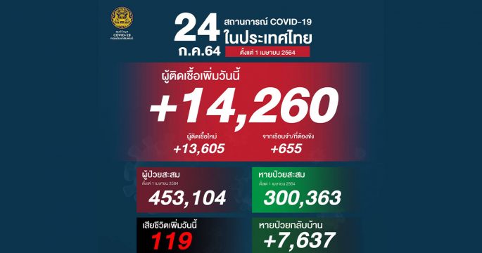 โควิดวันนี้ ยังวิกฤติ ยอดติดเชื้อพุ่ง 14,260 ราย ยืนยันสะสม 453,104 ราย (ตั้งแต่ 1 เมษายน) หายป่วยกลับบ้าน 7,637 ราย เสียชีวิตอีก 119 ราย