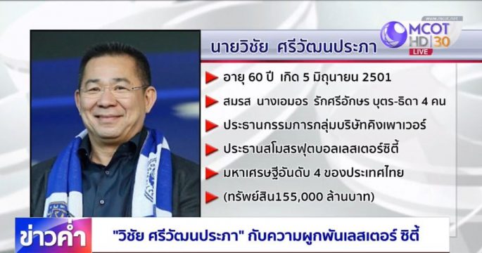 บีบีซีรายงานอ้างแหล่งข่าวทางครอบครัวยืนยันว่า นายวิชัย ศรีวัฒนประภา ประธานสโมรสรเลสเตอร์ซิตี้อยู่บนเฮลิคอปเตอร์ที่ประสบเหตุตก