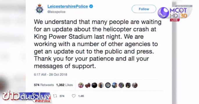 สโมสรเลสเตอร์ ซิตี้ ยังไม่ออกแถลงการณ์ใดๆ เกี่ยวกับรายละเอียดอุบัติเหตุเฮลิคอปเตอร์ของ “วิชัย ศรีวัฒนประภา” เจ้าของสโมสรฯ ตก ขณะที่ตำรวจเลสเตอร์เชียร์ ขอให้ทุกฝ่ายอดทนจนกว่าจะทราบรายละเอียดที่ชัดเจน