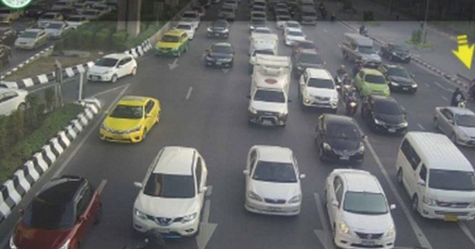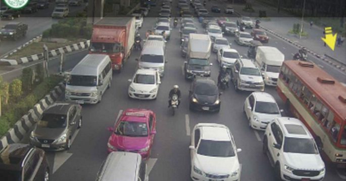 สวพ.FM 91 รายงานจราจรเช้าวันจันทร์ ถนนวิภาวดี-รังสิต ขาเข้า มุ่งหน้าไปใต้ด่วนดินแดง รถติดขัด ท้ายสะสมอยู่ที่หน้า ม.หอการค้าไทย