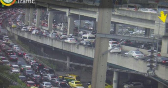 สวพ.FM 91 รายงานจราจรเช้าวันอังคาร ถนนวิภาวดี-รังสิต ขาเข้า จากแยกสุทธิสาร มุ่งหน้าใต้ด่วนดินแดง ไปอนุสาวรีย์ชัยฯ ติดขัดมาก ท้ายสะสมหน้าสถานีโทรทัศน์ NBT