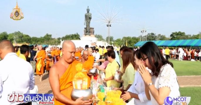 พุทธศาสนิกชนนำข้าวสาร อาหารแห้ง ร่วมทำบุญตักบาตร เพื่อความเป็นสิริมงคล เนื่องในวันวิสาขบูชา ที่พุทธมณฑล จ.นครปฐม
