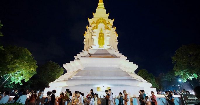 ประชาชนและนักท่องเที่ยวกว่า 3,000 คน ร่วมเวียนเทียนวิสาขบูชาเมืองโบราณ สมุทรปราการ รอบพระธาตุบังพวนจำลองจากหนองคาย