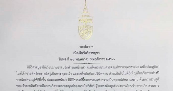 สมเด็จพระสังฆราช ประทานธรรมโอวาท ในวันวิสาขบูชาโลก “ปญฺญา โลกสฺมํ ปชฺโชโต ปัญญาเป็นแสงสว่างในทางโลก ” แนะชาวพุทธ มีสติรู้ ความเป็นจริงของชีวิต ช่วยพ้นกองทุกข์