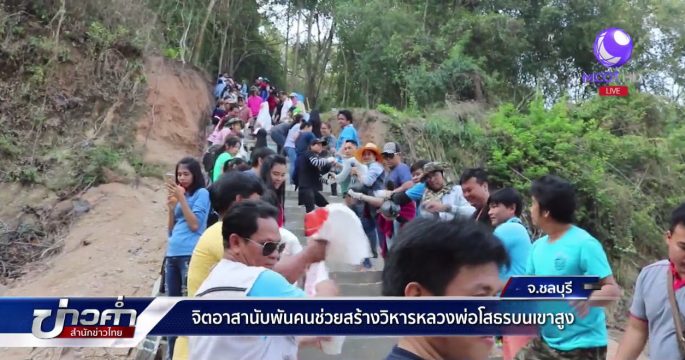 จิตอาสาเดินทางสู่วัดเขาตะแบก อ.ศรีราชา จ.ชลบุรี ช่วยพระสร้างวิหารหลวงพ่อโสธรบนเขาสูง หลังมีภาพเผยแพร่พระรูปหนึ่งแบกปูนขึ้นบันไดกว่า 400 ขั้น ในสื่อโซเชียล