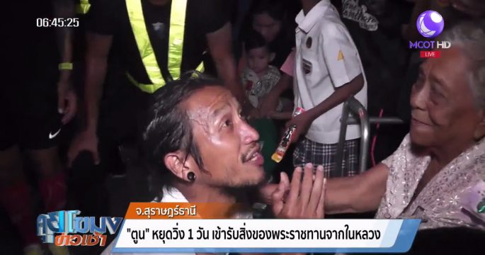 “ตูน บอดี้สแลม” วิ่งเข้าสู่จุดหมายที่ จ.สุราษฎร์ธานี แล้ว แพทย์ทำกายภาพบำบัดทันที ขณะที่ผู้ว่าฯ สุราษฎร์ธานี รอต้อนรับและมอบเงินที่พับเป็นรูปหัวใจ และวันนี้จะเข้ารับสิ่งของพระราชทานจากสมเด็จพระเจ้าอยู่หัว