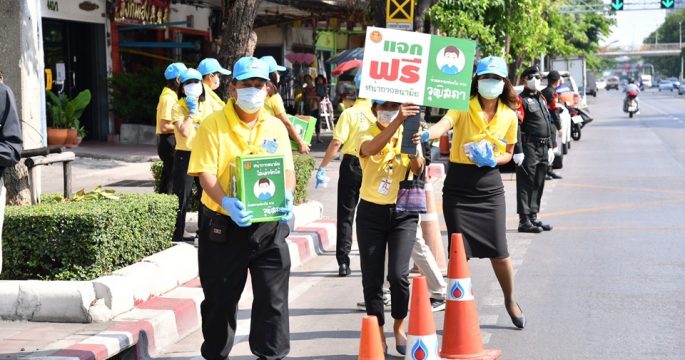 วุฒิสภาแจกหน้ากากอนามัยให้กับประชาชนที่สัญจรไปมาบริเวณหน้าอาคารสุขประพฤติ รณรงค์ให้ประชาชนป้องกันตัวจากการระบาดของไวรัสโควิด-19