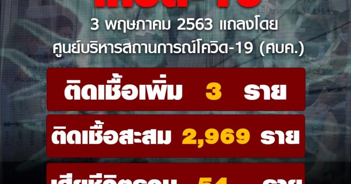 สถานการณ์โรคโควิด-19 ในไทยผู้ป่วยรายใหม่เริ่มคงที่ ติดเชื้อเพิ่ม 3 ราย สะสม 2,969 ราย หายป่วยสะสม 2,739 ราย และไม่มีผู้เสียชีวิตเพิ่ม