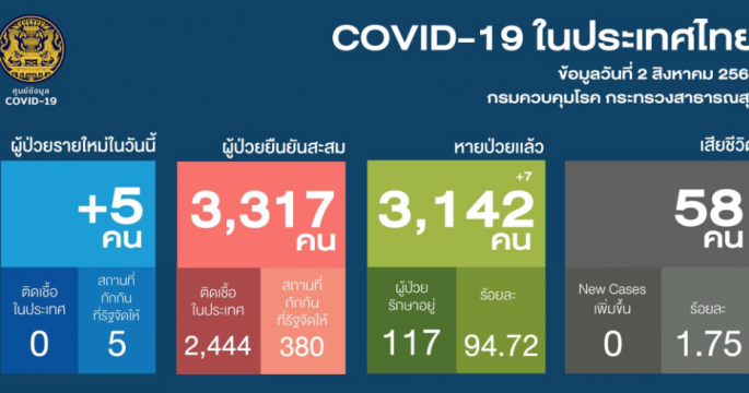 ศบค.แถลงวันนี้พบผู้ป่วยใหม่เพิ่ม 5 ราย ยืนยันสะสม 3,317 ราย หายป่วยเพิ่ม 7 ราย ไม่มีเสียชีวิตเพิ่มยังคงที่ 58 ราย