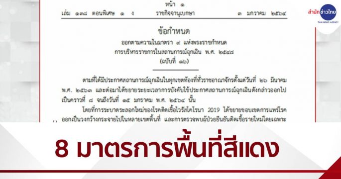 ราชกิจจาฯ ออก 8 มาตรการ ในพื้นที่สีแดง 28 จังหวัด มีผลวันที่ 4 ม.ค. เวลา 06.00 น. เป็นต้นไป หลัง ศบค. แถลงตัวเลขผู้ป่วยใหม่ในประเทศ พุ่ง 315 คน ใน 53 จังหวัด