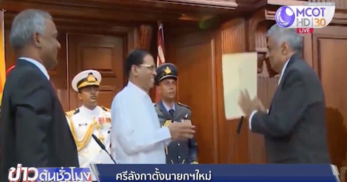 ศรีลังกา 16 ธ.ค.-ประธานาธิบดีไมตรีพาลา สิริเสนาของศรีลังกาประกาศแต่งตั้งนายรานิล วิกรมสิงเห เป็นนายกรัฐมนตรีอีกครั้งหนึ่ง หลังจากที่ถูกปลดออกจากตำแหน่ง เมื่อเกือบ 2 เดือนที่แล้ว ซึ่งทำให้เกิดภาวะชะงักงันทางการเมืองนับแต่นั้นเป็นต้นมา โดยพิธีสาบานตนเข้ารับตำแหน่งทำกันในวันนี้ สำหรับคณะรัฐมนตรีชุดใหม่ของศรีลังกา คาดว่าจะทำพิธีสาบานตนเข้ารับตำแหน่งในเร็วๆ นี้นายสิริเสนาสั่งปลดนายวิกรมสิงเห เมื่อวันที่ 26 ตุลาคมที่ผ่านมา และแต่งตั้งนายมหินทา ราชปักษาเข้าเป็นนายกรัฐมนตรีแทน นายวิกรมสิงเห ยืนกรานว่า การปลดตนออกจากตำแหน่งไม่ชอบด้วยกฎหมาย และนายราชปักษาก็ไม่ผ่านความเห็นชอบจากรัฐสภา ให้ดำรงตำแหน่งนายกรัฐมนตรี ศาลสูงพิพากษายืนตามศาลชั้นต้น ให้ระงับการปฏิบัติหน้าที่ของนายราชปักษา จนทำให้นายราชปักษาต้องยอมลาออกเมื่อวานนี้.-สำนักข่าวไทย