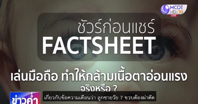 บนสังคมออนไลน์ แชร์เตือนว่า การปล่อยให้เด็กเล่นมือถือนาน ๆ จะส่งผลให้กล้ามเนื้อตาอ่อนแรงได้ แต่ข้อเท็จจริงเรื่องนี้เป็นอย่างไร ติดตามจากศูนย์ชัวร์ก่อนแชร์