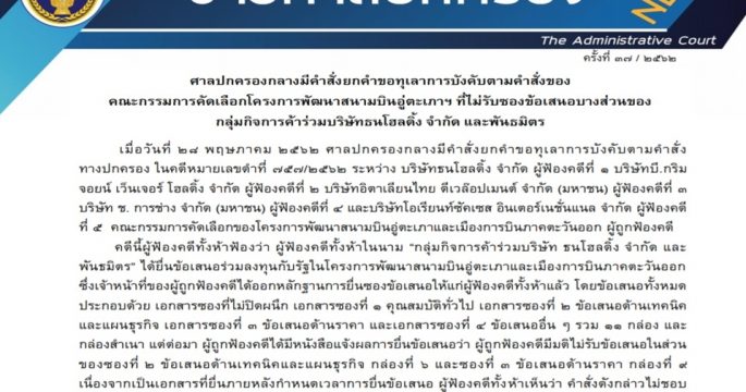 ศาลปกครองกลางยกคำร้อง “กลุ่มซีพีและพันธมิตร” ถูกตัดสิทธิ์ไม่รับซองโครงการสนามบินอู่ตะเภา