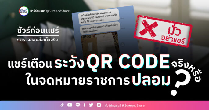 ตามที่มีการแชร์เตือนระวัง QR CODE ในจดหมายราชการปลอม นั้น 📌 บทสรุป : ❌ ไม่จริง ไม่ควรแชร์ต่อ ❌ เป็น QR CODE จริง เพื่อสำรวจความเชื่อมั่นของประชาชนต่อศาลปกครอง 👉 ศูนย์ชัวร์ก่อนแชร์ ตรวจสอบพบว่า บนเว็บไซต์ของสำนักงานศาลปกครอง ยืนยันว่า เอกสารดังกล่าวเป็นของจริง โดยเป็นแบบสำรวจความเชื่อมั่นของประชาชนต่อศาลปกครอง ทั้งนี้วันที่ 28 กุมภาพันธ์ 2567 พบว่า สำนักงานศาลปกครองได้ปิดรับแบบสำรวจฯ เนื่องจากได้จำนวนครบที่ต้องการแล้ว 👉 จากฐานข้อมูลศูนย์ชัวร์ก่อนแชร์ พบว่า ก่อนหน้านี้เคยมีจดหมายจริงจากหลายองค์กรถูกทำให้เข้าใจผิดว่าเป็นมิจฉาชีพ ทั้ง สำนักงานป้องกันและปราบปรามการฟอกเงิน (ปปง.) ใบสั่งจราจร ไปรษณีย์ไทย ธนาคารกสิกรไทย 👉 สำหรับกรณีที่ “สแกนแล้ว ถูกดูดเงินในบัญชีจนหมดบัญชี” ในทันทีนั้น มีความเป็นไปได้จริงน้อยมาก เพราะก่อนจะโอนเงินออกไปได้ จะต้องผ่านการสั่งงานและกดยืนยันหลายขั้นตอน ซึ่งคนร้ายมักจะใช้วิธีการ หลอกให้ติดตั้งแอป หลอกให้กรอกข้อมูล เพื่อนำไปใช้ในการโจรกรรมอีกต่อหนึ่ง ซึ่งมีขั้นตอนมากกว่าการสแกนในคราวเดียว 👉 […]
