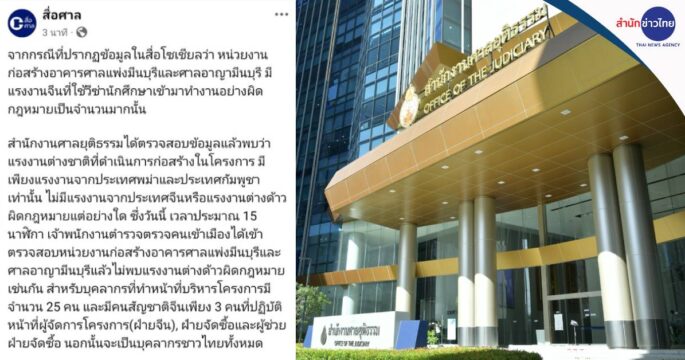ศาลยุติธรรม ยืนยันไม่มีแรงงานผิดกฎหมายในไซต์ก่อสร้างอาคารศาลแพ่งมีนบุรีและศาลอาญามีนบุรี หลังปรากฏข้อมูลในสื่อโซเชียล ย้ำเข้มงวดตรวจสอบการก่อสร้าง พร้อมรับแจ้งเบาะแสการกระทำผิด