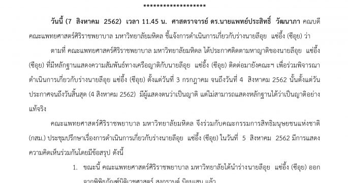 ศิริราชแจ้งการดำเนินการเกี่ยวกับร่างนายลีอุย แซ่อึ้ง (ซีอุย)