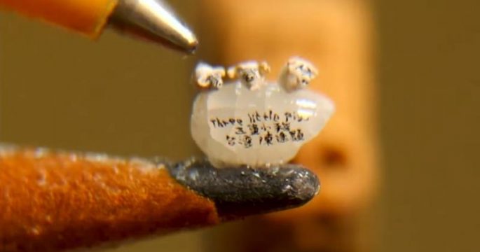 ศิลปินชาวไต้หวันแกะสลักลูกหมูสามตัวตามนิทานอีสปวางไว้บนเมล็ดข้าว ต้อนรับปีกุนที่กำลังจะมาถึงในต้นเดือนหน้า