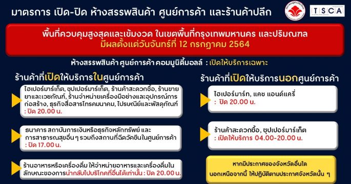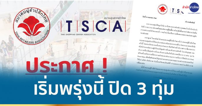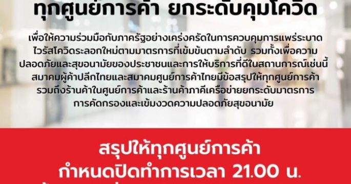 สมาคมผู้ค้าปลีกไทย และสมาคมศูนย์การค้าไทย ยกระดับคุมเข้มโควิด-19 เลื่อนปิดศูนย์การค้าและห้างสรรพสินค้าทั่วประเทศ 21.00 น. ทุกวัน เริ่มพรุ่งนี้
