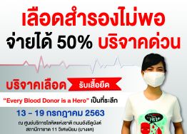 รศ.พญ.ดุจใจ ชัยวานิชศิริ ผอ.ศูนย์บริการโลหิตแห่งชาติ สภากาชาดไทย เผยจากสถานการณ์ปัจจุบันโรงพยาบาลเปิดให้บริการรักษาผู้ป่วยได้ตามปกติ ทำให้โรงพยาบาลทั่วประเทศกว่า 340 แห่ง เบิกขอใช้โลหิตสูงกว่า 7,000 ยูนิต/วัน แต่ศูนย์บริการโลหิตแห่งชาติสามารถจ่ายเลือดได้เพียง 50% เท่านั้น จึงขอเชิญชวนผู้ที่มีสุขภาพดี ครบกำหนด 3 เดือน บริจาคโลหิต เพื่อนำไปรักษาผู้ป่วยตามโรงพยาบาลทั่วประเทศ สำหรับผู้บริจาคโลหิต ระหว่างวันที่ 13-19 ก.ค.63 รับเสื้อยืด “Every Blood Donor is a Hero” เป็นที่ระลึก