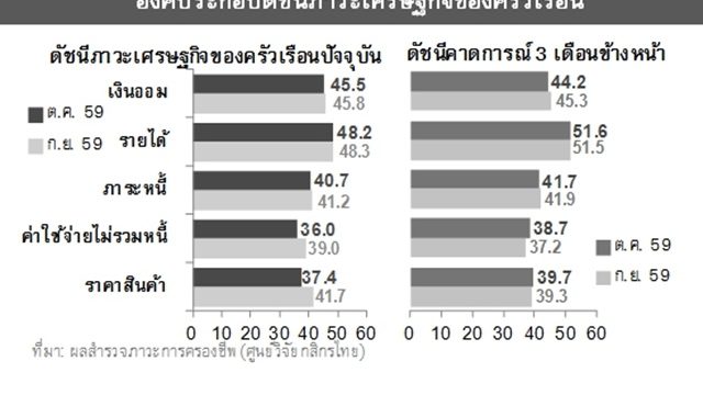 ศูนย์วิจัยกสิกรไทยเผยดัชนีภาวะเศรษฐกิจครัวเรือนเดือน ต.ค.59 กลับมาปรับตัวลดลงอยู่ที่ระดับ 42.9 กังวลราคาสินค้าสูงขึ้น