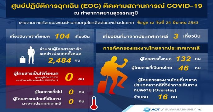 ศูนย์ EOC เผยผลคัดกรองผู้โดยสาร พบเข้าข่ายเสี่ยงติดเชื้อ 1 ราย ต่างชาติถูกปฏิเสธเข้าเมือง 37 ราย