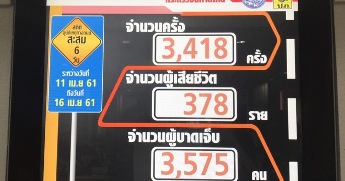 ศปถ.สรุปสถิติ 6 วันของการรณรงค์ “ขับรถมีน้ำใจ รักษาวินัยจราจร” เกิดอุบัติเหตุรวม 3,418 ครั้ง ผู้เสียชีวิต 378 ราย บาดเจ็บ 3,575 คน