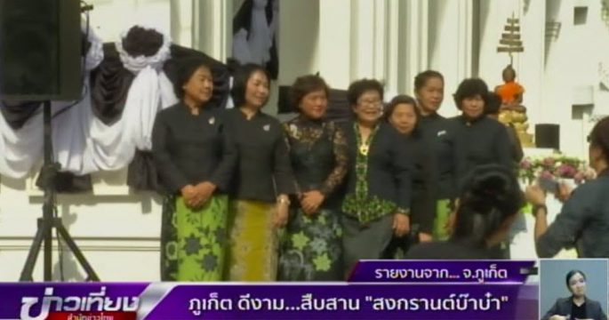 ประชาชนชาวภูเก็ตพร้อมใจกันแต่งกายด้วยชุดย่าหยาบาบ๋า ชุดพื้นเมืองของภูเก็ต มาร่วมงานวิถีน้ำ วิถีไทย ตามแนวคิดภูเก็ต ดีงาม…สืบสานสงกรานต์บาบ๋า