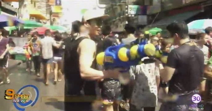 นักท่องเที่ยวทั้งชาวไทยและชาวต่างชาติเนืองแน่นถนนข้าวสารเล่นน้ำกันอย่างสนุกสนาน ท่ามกลางการดูแลรักษาความปลอดภัยของเจ้าหน้าที่ตำรวจ