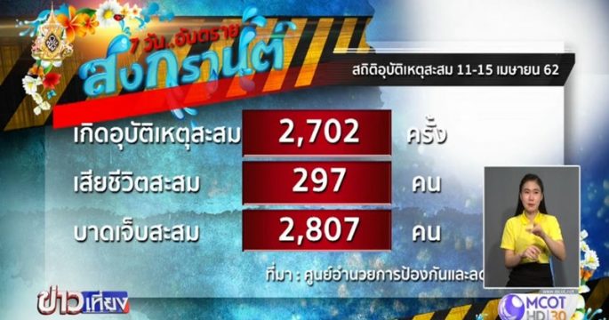 อุบัติเหตุสะสม 6 วัน ตั้งแต่วันที่ 11-16 เมษายน เกิดอุบัติเหตุ 3,068 ครั้ง เสียชีวิต 348 คน บาดเจ็บ 3,176 คน จังหวัดที่เกิดอุบัติเหตุสะสมสูงสุดคือ เชียงใหม่ 119 ครั้ง