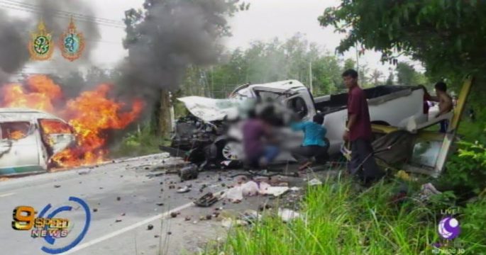 เจ้าหน้าที่เร่งช่วยเหลือผู้ได้รับบาดเจ็บออกจากซากรถ หลังเกิดเหตุรถตู้โดยสารชนกับรถกระบะ บนถนนสายลำไพล – สะบ้าย้อย จังหวัดสงขลา