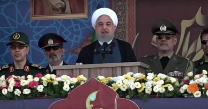 ประธานาธิบดีฮัสซัน โรวฮานี ผู้นำอิหร่านแถลงก่อนการสวนสนามในวันครบรอบสงครามอิหร่าน-อิรัก ประณามการมีกองกำลังต่างชาติในอ่าวเปอร์เซีย
