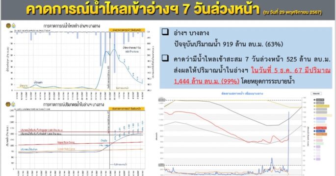 สทนช. เฝ้าระวังสถานการณ์น้ำเขื่อนบางลาง คาด 7 วันข้างหน้าจะมีปริมาณน้ำไหลเข้า 500 ล้าน ลบ.ม. ส่งผลให้เกือบเต็มความจุเก็บกัก จึงต้องปรับเพิ่มการระบาย ช่วงวันที่ 2-4 ธ.ค. ยังมีฝนตกต่อเนื่อง ตั้งแต่ จ.สุราษฎร์ธานี ลงไป โดยเฉพาะ 3 จังหวัดชายแดนภาคใต้ จากนั้น 4-6 ธ.ค. จะได้รับอิทธิพลจากภาวะน้ำทะเลหนุนสูง