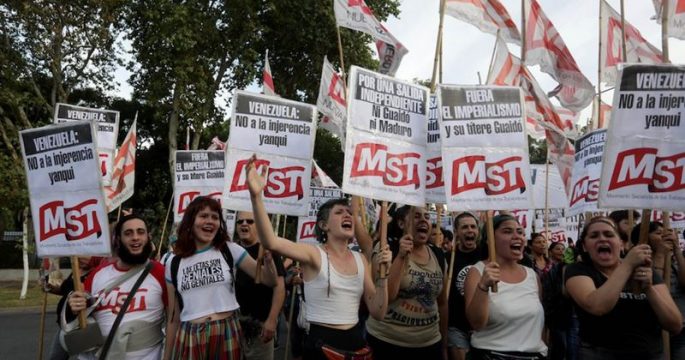 กลุ่มประชาสังคมฝ่ายซ้ายในอาร์เจนตินาเดินขบวนมายังสถานทูตสหรัฐในกรุงบัวโนสไอเรสวันพุธ เพื่อประท้วงนโยบายของรัฐบาลสหรัฐที่มีต่อเวเนซุเอลา
