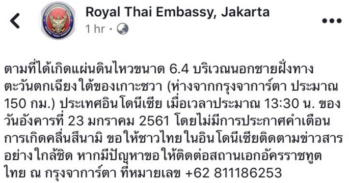 สถานทูตไทย ณ กรุงจาการ์ตา ขอให้ชาวไทยในอินโดนีเซียติดตามข่าวสารใกล้ชิด หลังเกิดแผ่นดินไหวนอกชายฝั่งทางตะวันตกเฉียงใต้ของเกาะชวา