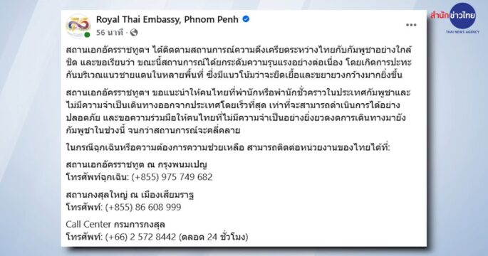 24 ก.ค. – สถานทูตไทยในในพนมเปญ เเนะคนไทยที่อยู่ในกัมพูชาเดินทางออกนอกประเทศโดยเร็ว เนื่องจากความตึงเครียดระหว่างไทยเเละกัมพูชา สถานเอกอัครราชทูตฯ ได้ติดตามสถานการณ์ความตึงเครียดระหว่างไทยกับกัมพูชาอย่างใกล้ชิด และขณะนี้สถานการณ์ได้ยกระดับความรุนแรงอย่างต่อเนื่อง โดยเกิดการปะทะกันบริเวณแนวชายแดนในหลายพื้นที่ ซึ่งมีแนวโน้มว่าจะยืดเยื้อและขยายวงกว้างมากยิ่งขึ้น ขอแนะนำให้คนไทยที่พำนักหรือพำนักชั่วคราวในประเทศกัมพูชาและไม่มีความจำเป็นเดินทางออกจากประเทศโดยเร็วที่สุด และขอความร่วมมือให้คนไทยที่ไม่มีความจำเป็นงดเดินทางมายังกัมพูชาในช่วงนี้ จนกว่าสถานการณ์จะคลี่คลาย ในกรณีฉุกเฉินหรือความต้องการความช่วยเหลือ สามารถติดต่อหน่วยงานของไทยได้ที่ สถานเอกอัครราชทูต ณ กรุงพนมเปญ โทรศัพท์ฉุกเฉิน: (+855) 975 749 682 สถานกงสุลใหญ่ ณ เมืองเสียมราฐ โทรศัพท์: (+855) 86 608 999 Call Center กรมการกงสุล โทรศัพท์: (+66) 2 572 8442 ตลอด 24 ชั่วโมง .-สำนักข่าวไทย